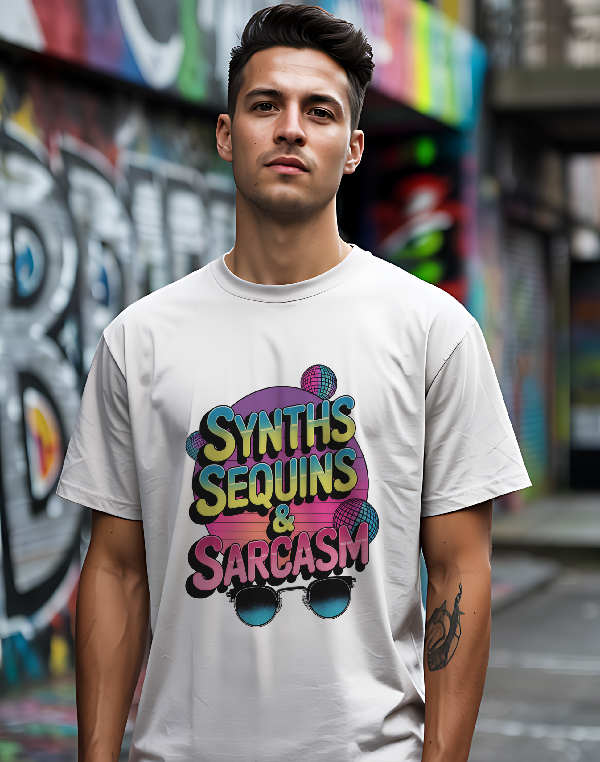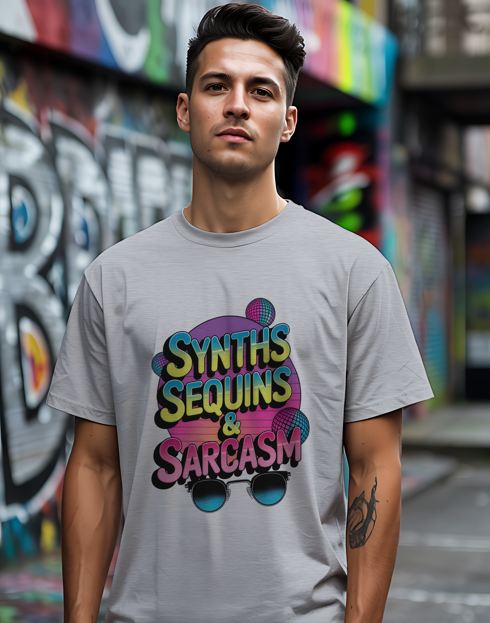 Synths Sequins & Sarcasm Tee π§ 80s Retro Sarcastic Music Shirt